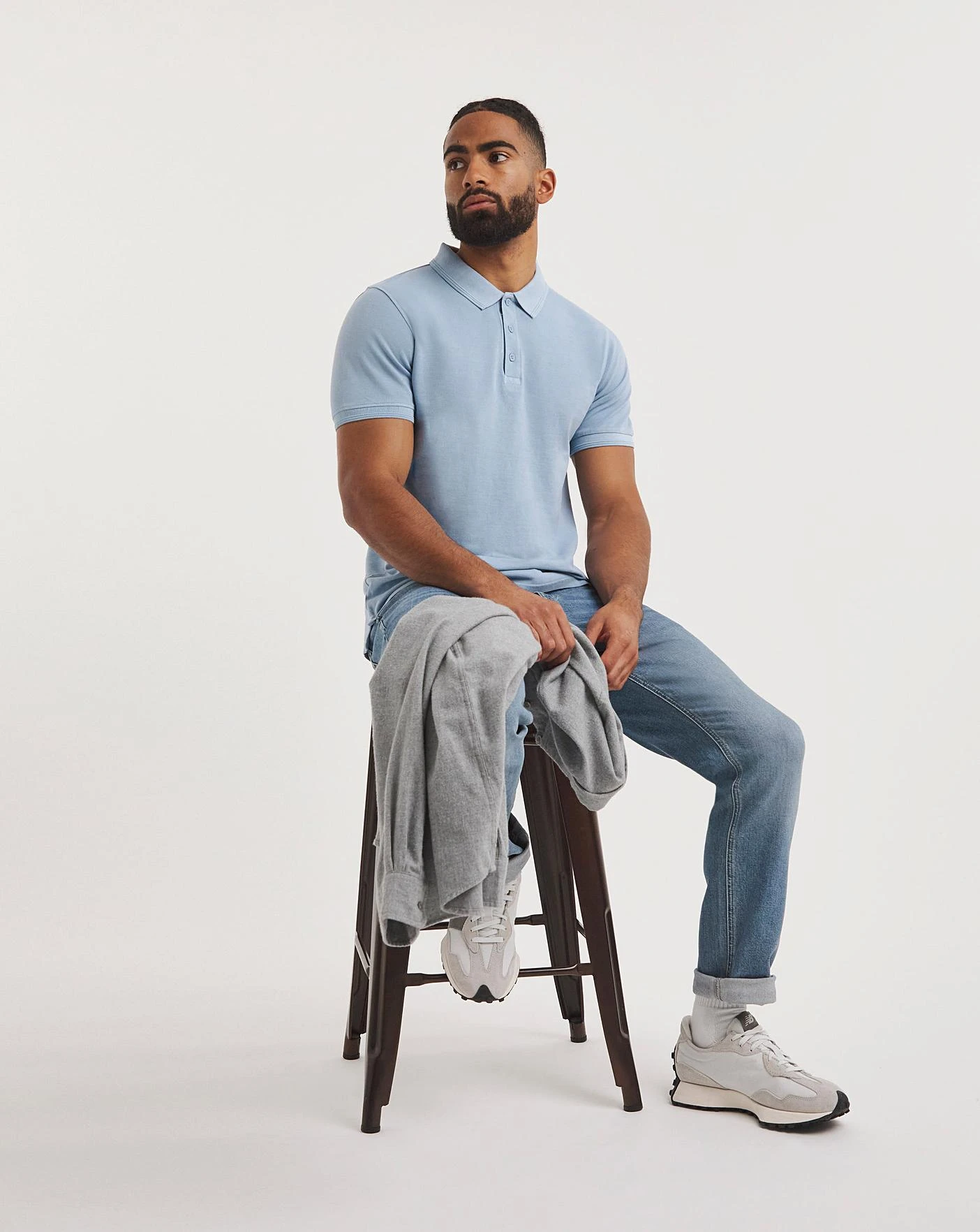 This Garment Dye Polo in a long length in mid blue is fresh and stylish for the season. The long length creates added fit and comfort.