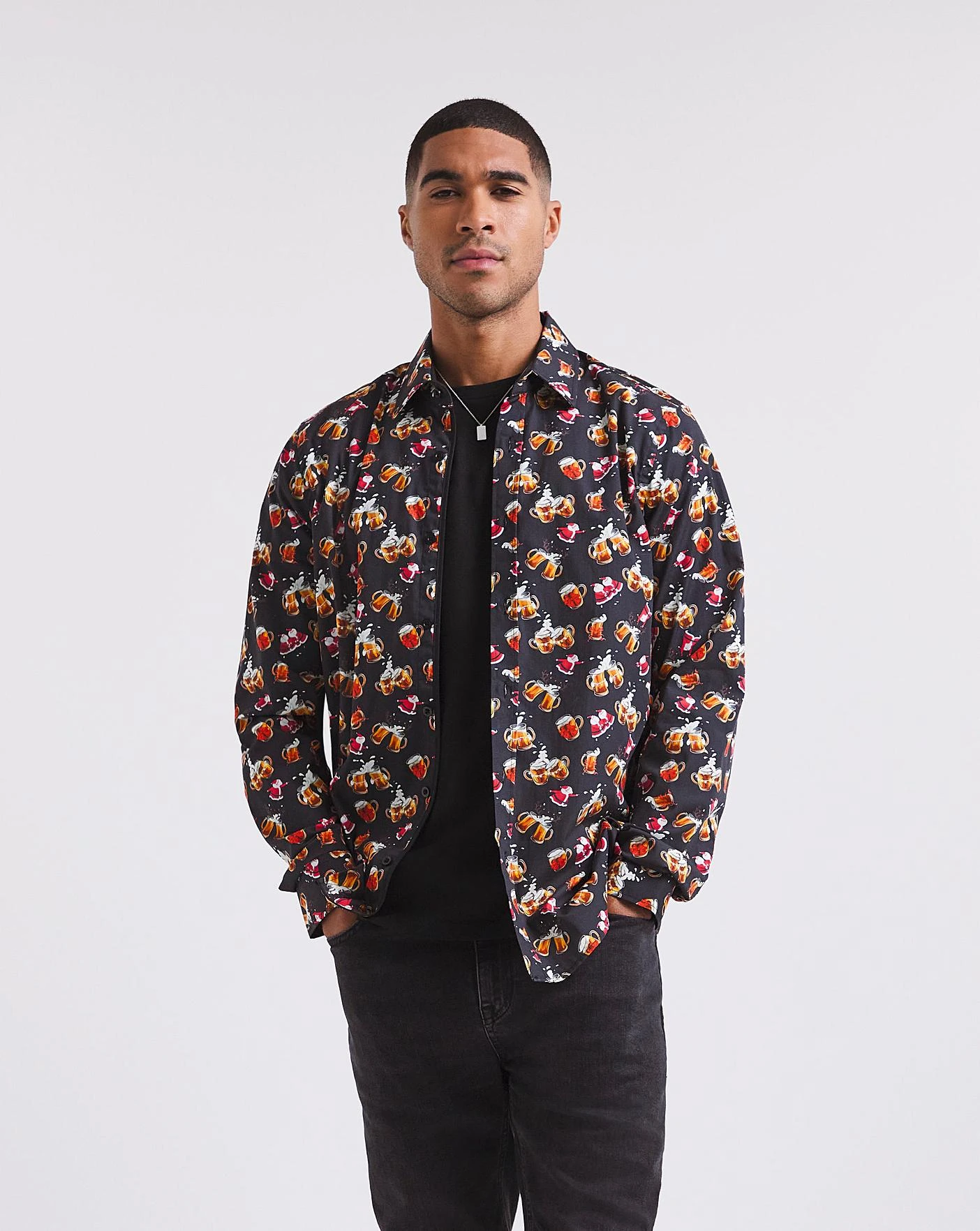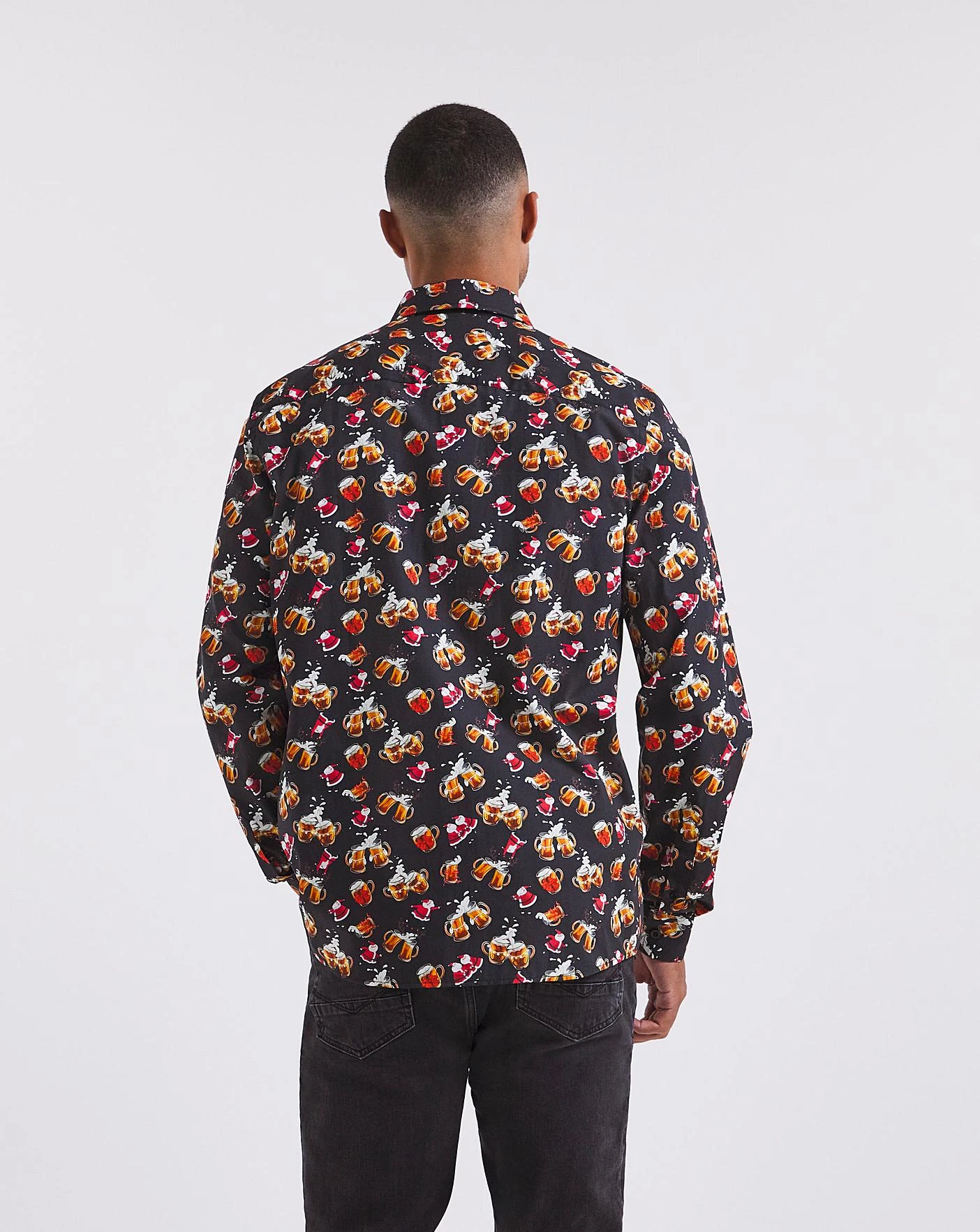 Joe Browns Cheers to Christmas Shirt in Black. This bold button-down collard shirt features long sleeves and all over festive design. It’s abstract and perfect for the new season. Simply pair with your favourite denim jeans to dress it down or style with some black trousers for a smarter look.