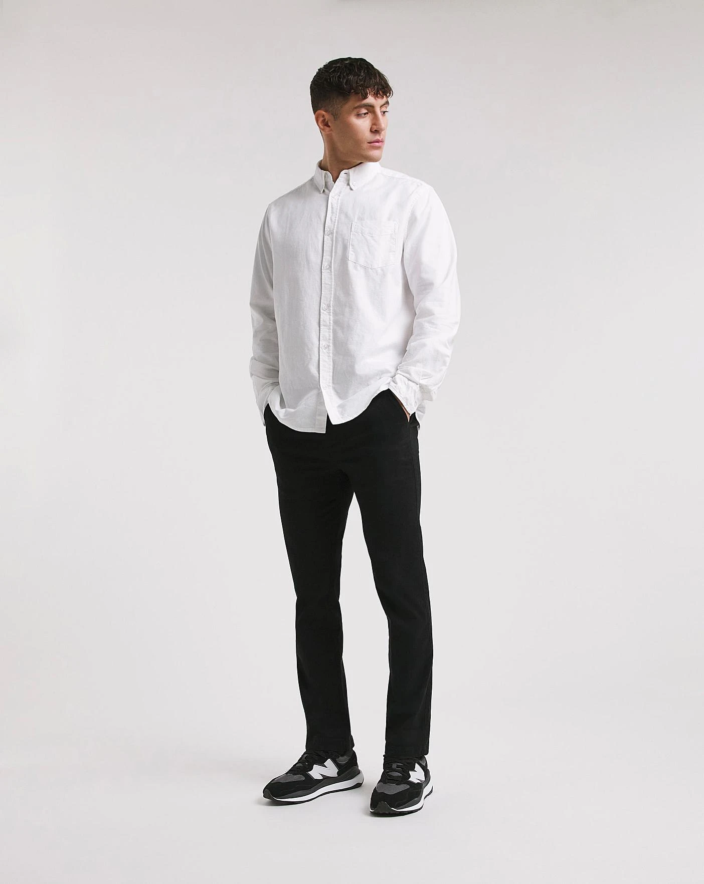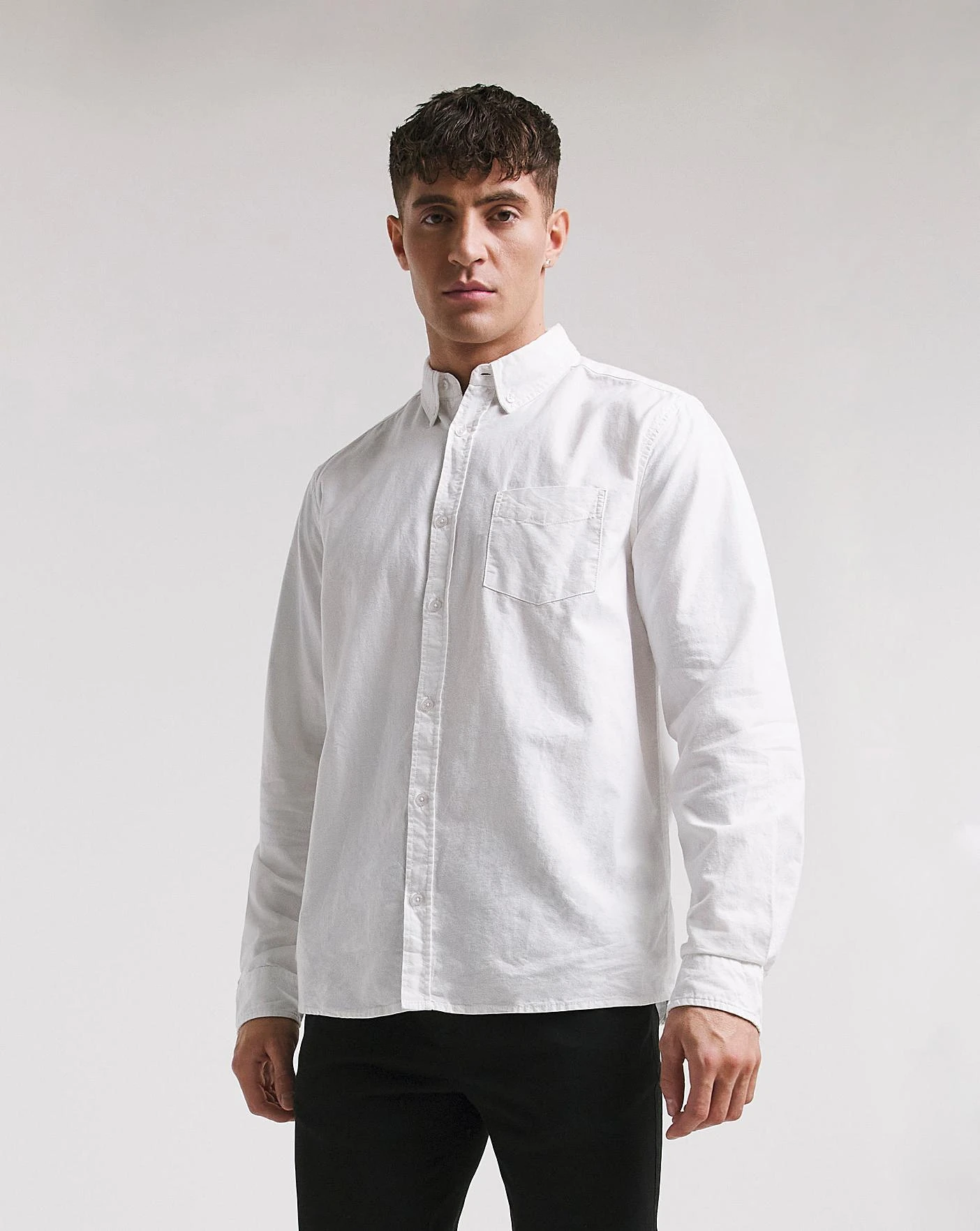 Long sleeve long length oxford shirt in White. This shirt is perfect to pair with some causal jeans for a relaxed daytime look.