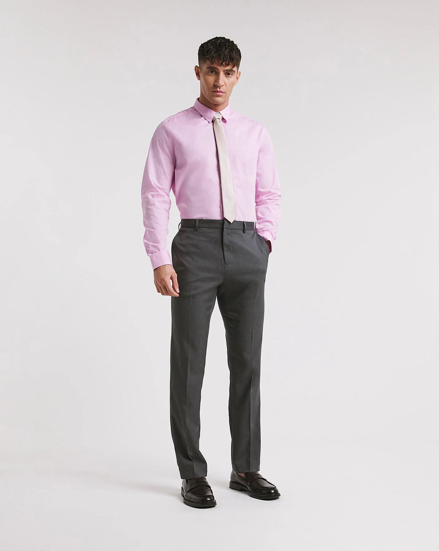 Long-sleeved plain formal shirt with button front fasten and button cuffs.