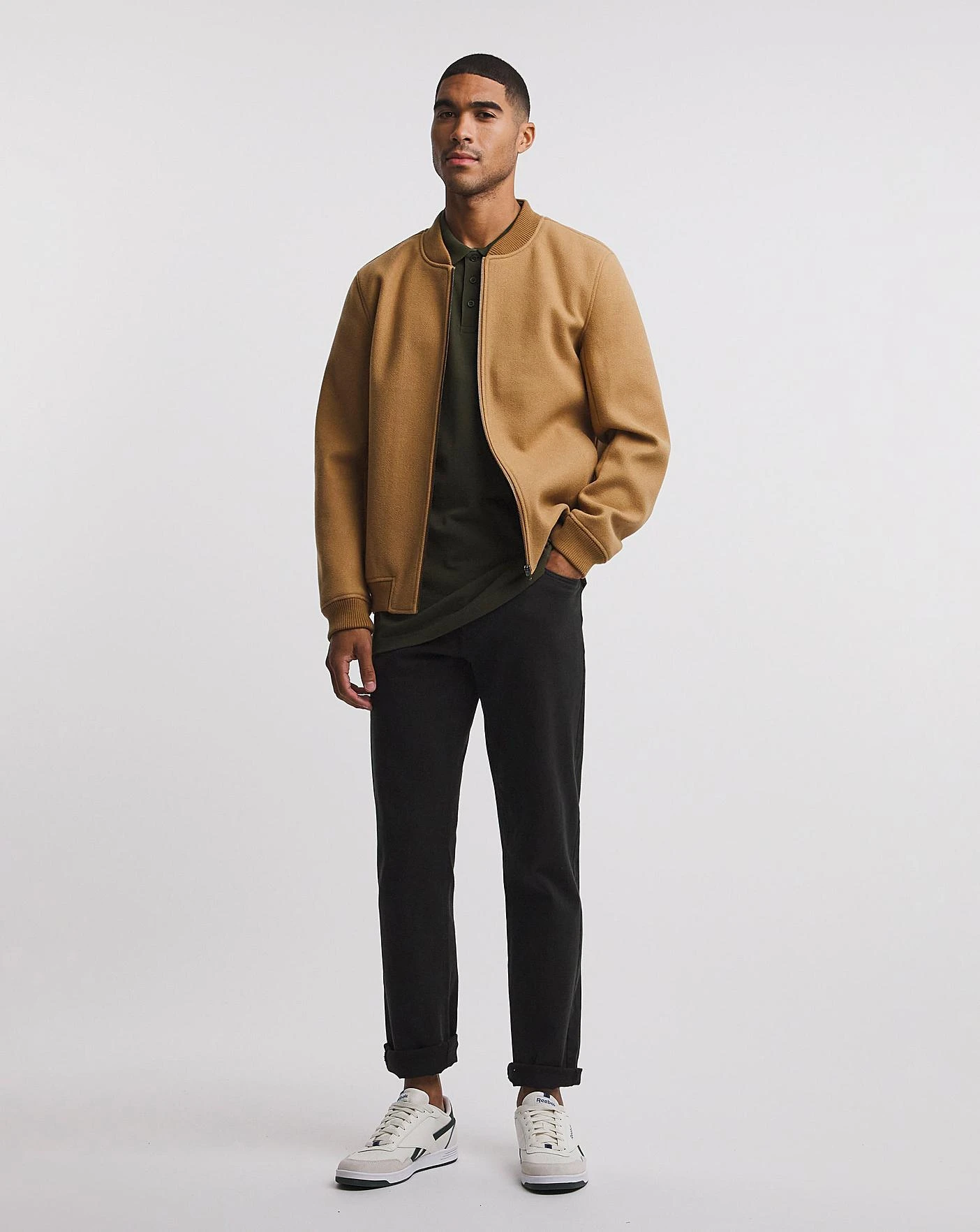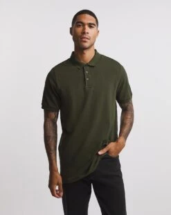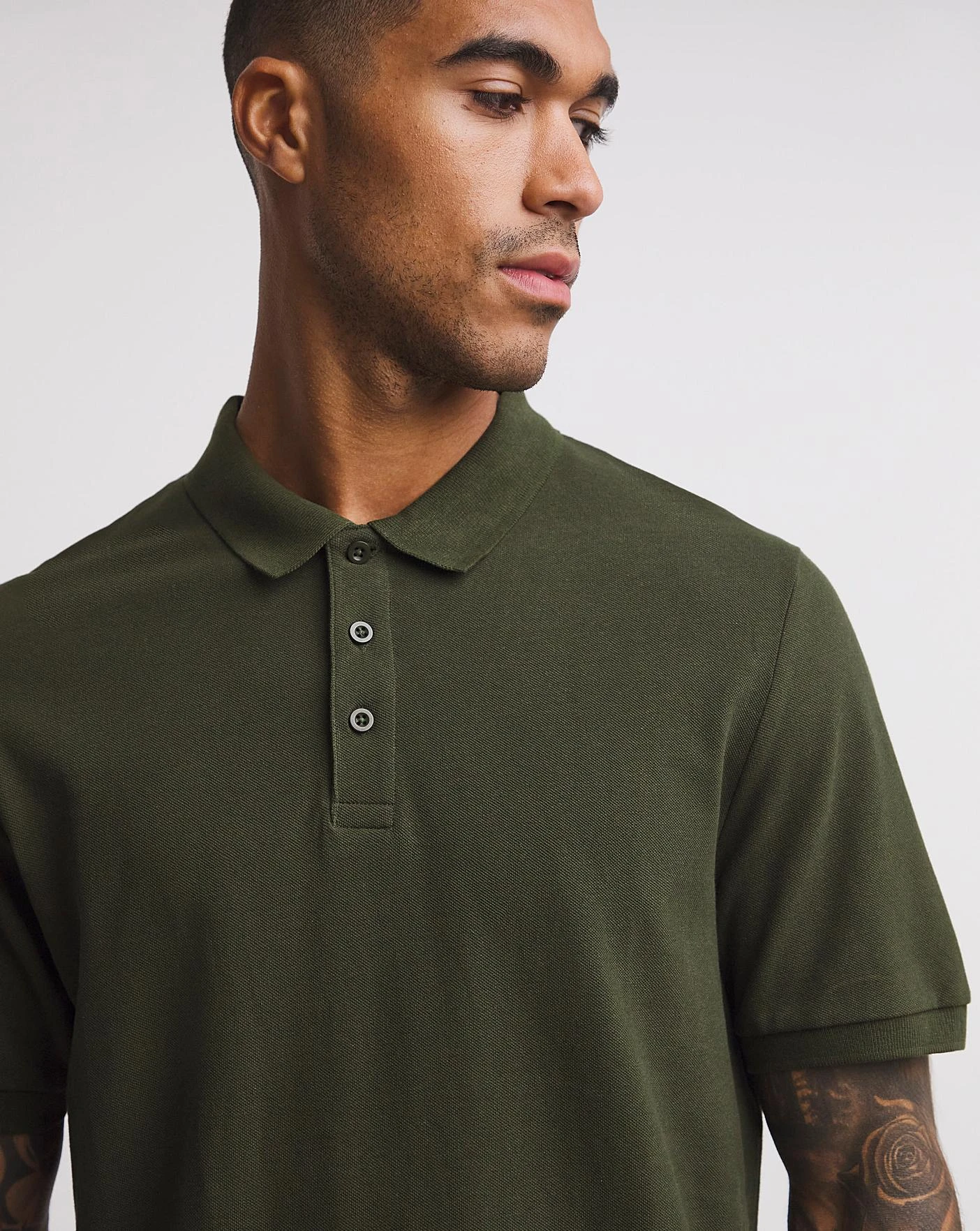 This pique polo in a long length in dark khaki is comfortable and breathable for the season.