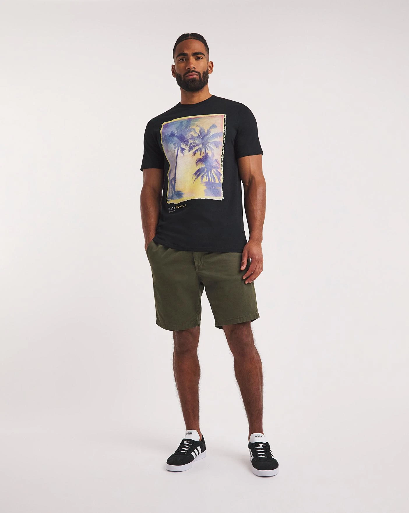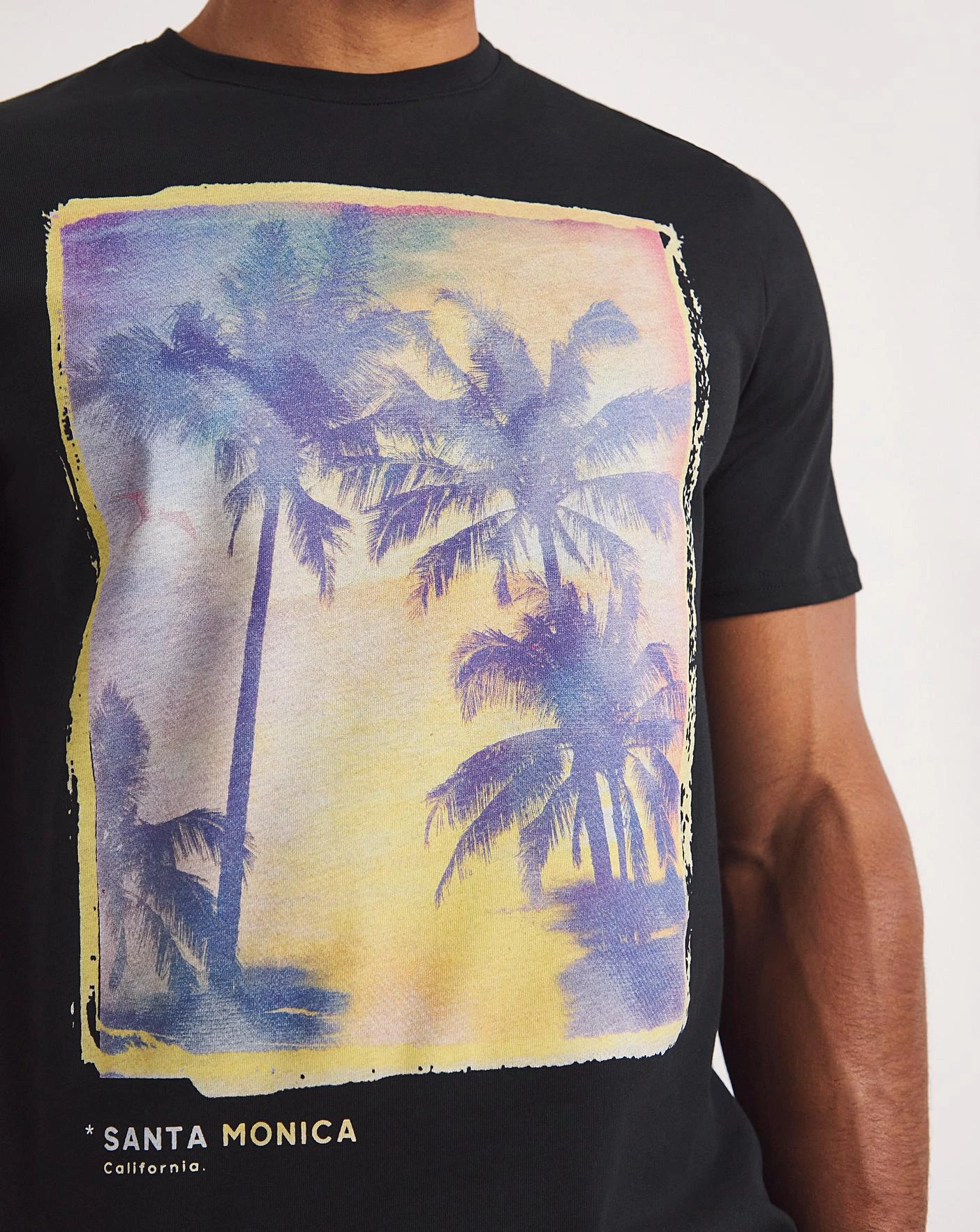 This Santa Monica Graphic T-shirt in black and in a long length is fresh and comfortable for the season. The graphic style, is great for any casual look this season.