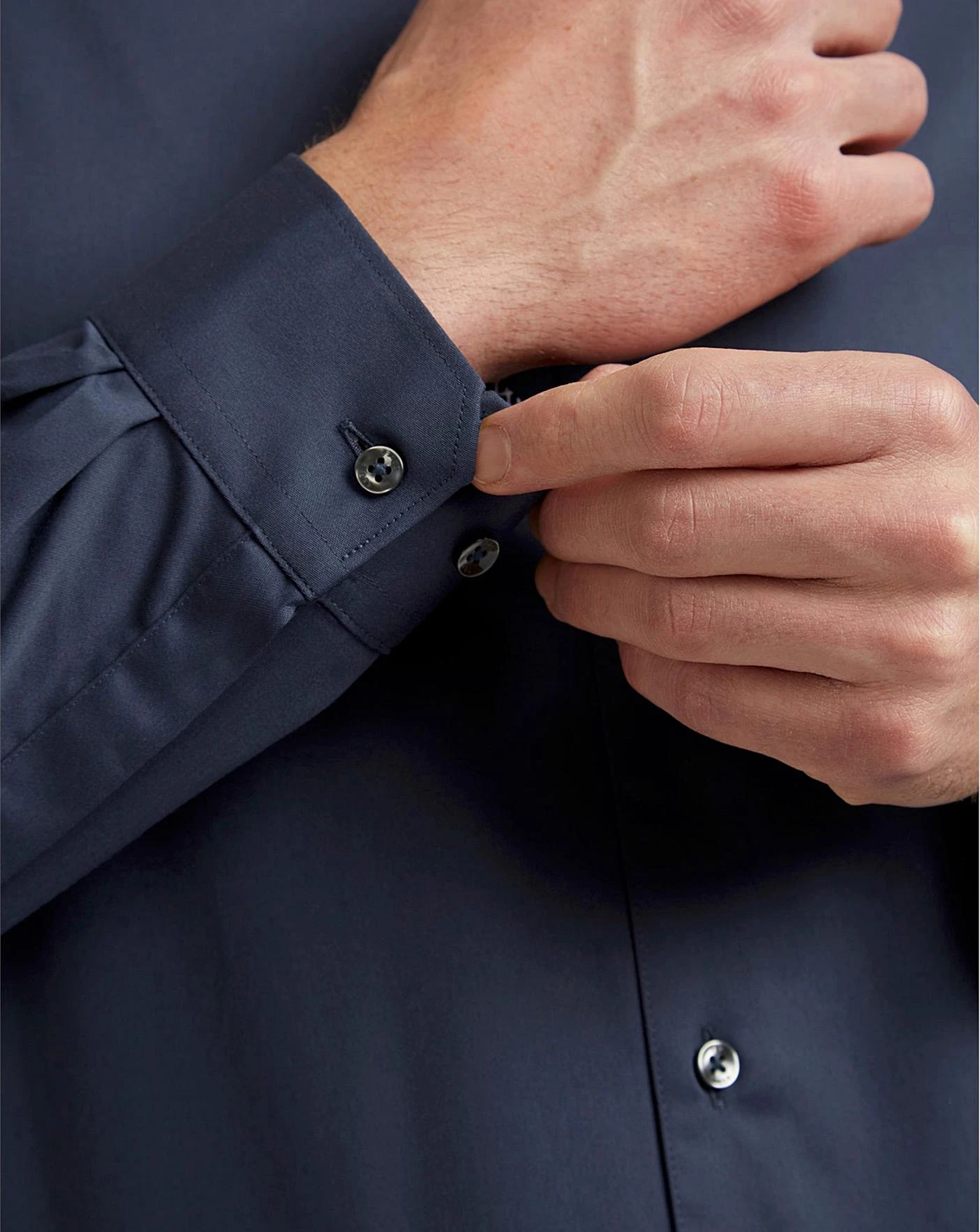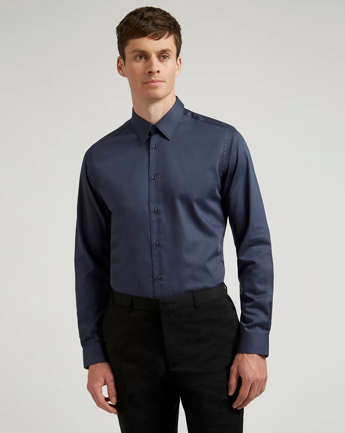 Easy, breezy, navy sateen. This piece is here to keep you soft and sweet. This 100% cotton shirt from Ted Baker comes in a slim fit, to flatter and impress. This breathable shirt has been made in a navy sateen fabric to give your formalwear an extra luxurious feel and tone. Suave and soft.